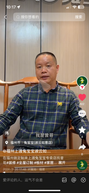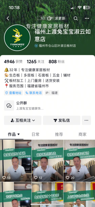 “大家好!我是曾哥,在福州上渡做兔宝宝板材10年了”。打开福州上渡店的抖音账号,老板林总的出镜视频占据了核心位置。福建销售公司提供了全方位支持,没有华丽的包装,没有生硬的台词,林总用一口地道的福州话搭配朴实的表达,瞬间拉近了与本地消费者的距离。除了产品实测,曾总还聚焦福州业主的装修痛点:针对老房改造户型局促的问题,他实地探访完工案例,讲解“小空间扩容定制方案”;结合福州潮湿气候,分享“板材防潮处理技巧”;甚至在直播中化身“装修顾问”,免费解答网友关于板材选型、预算规划的疑问,用专业价值沉淀私域。